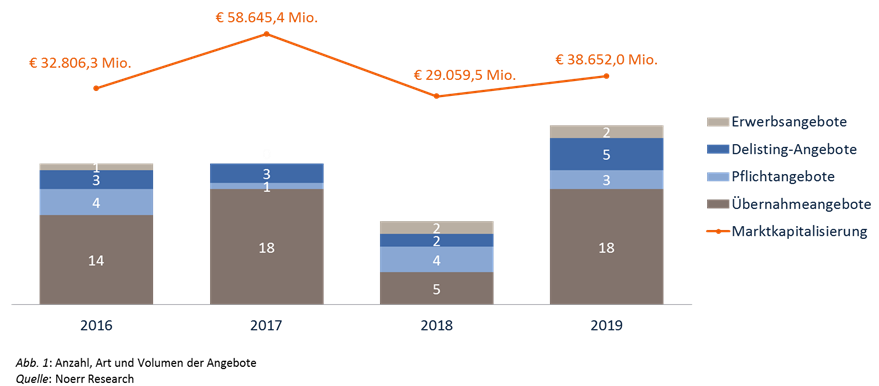 Im Jahr 2019 hat die Bundesanstalt für Finanzdienstleistungsaufsicht („BaFin“) 28 öffentliche Angebote nach dem Wertpapiererwerbs- und Übernahmegesetz („WpÜG“) gestattet und veröffentlicht. Die Angebote betrafen Zielgesellschaften mit einer Marktkapitalisierung zum Angebotspreis („MKA“) von insgesamt EUR 38,7 Mrd. Die Angebote gliederten sich in achtzehn Übernahmeangebote, fünf Delisting-Angebote, zwei Erwerbsangebote, und drei Pflichtangebote. Es gab außerdem eine Untersagung mangels rechtzeitiger Veröffentlichung einer Angebotsunterlage.
