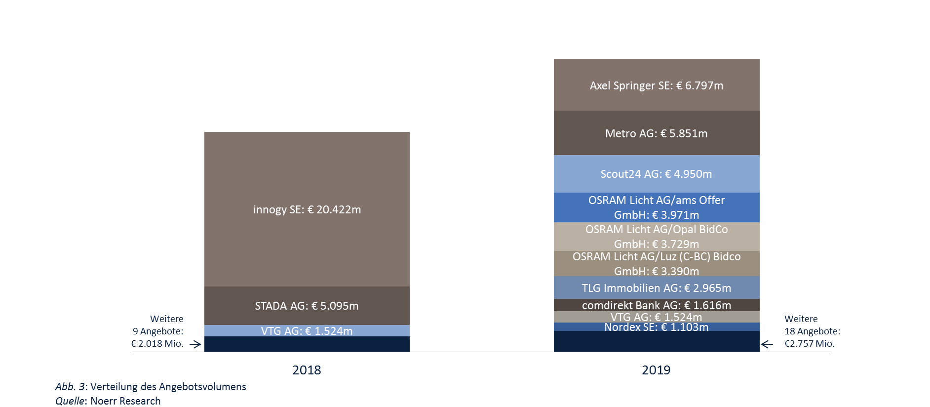 Mit einer Transaktionszahl von elf Transaktionen und einem durchschnittlichen Angebotsvolumen von EUR 229,8 Mio. sind im Mid-Cap-Segment keine erheblichen Abweichungen zum Vorjahr zu erkennen, wobei es 2018 zwar nur sieben Transaktionen, aber ein höheres durchschnittliches Angebotsvolumen gab als 2019.