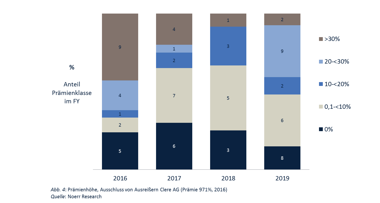 Zwar betrugen elf der 2019 gezahlten Prämien über 20%, jedoch waren nur zwei Angebote in der höchsten Prämienklasse von mehr als 30% zu verzeichnen. Bei der durchschnittlichen Prämienhöhe ist allerdings ein signifikanter Anstieg (um 116,58%) gegenüber 2018, wo sie nur 8,08% betrug, festzustellen. Auch 2017 lag die durchschnittliche Prämienhöhe mit 12,09% deutlich unter dem Wert von 2019.
