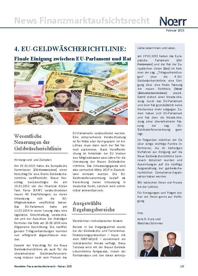 Am 27.01.2015 haben das Europäische Parlament (EU-Parlament) und der Rat der Europäischen Union (Rat) im Rahmen der sog. „Trilogverhandlungen“ über die 4. EU-Geldwäscherichtlinie eine Einigung über eine finale Fassung der neuen Richtlinie (Neue Geldwäscherichtlinie) erzielt. Damit stehen einer Verabschiedung durch das EU-Parlament und dem Rat grundsätzlich keine Hindernisse mehr entgegen. Zudem haben sich EU-Parlament und Rat über die Verabschiedung einer überarbeiteten Fassung der sog. EU-Geldtransferverordnung geeinigt.