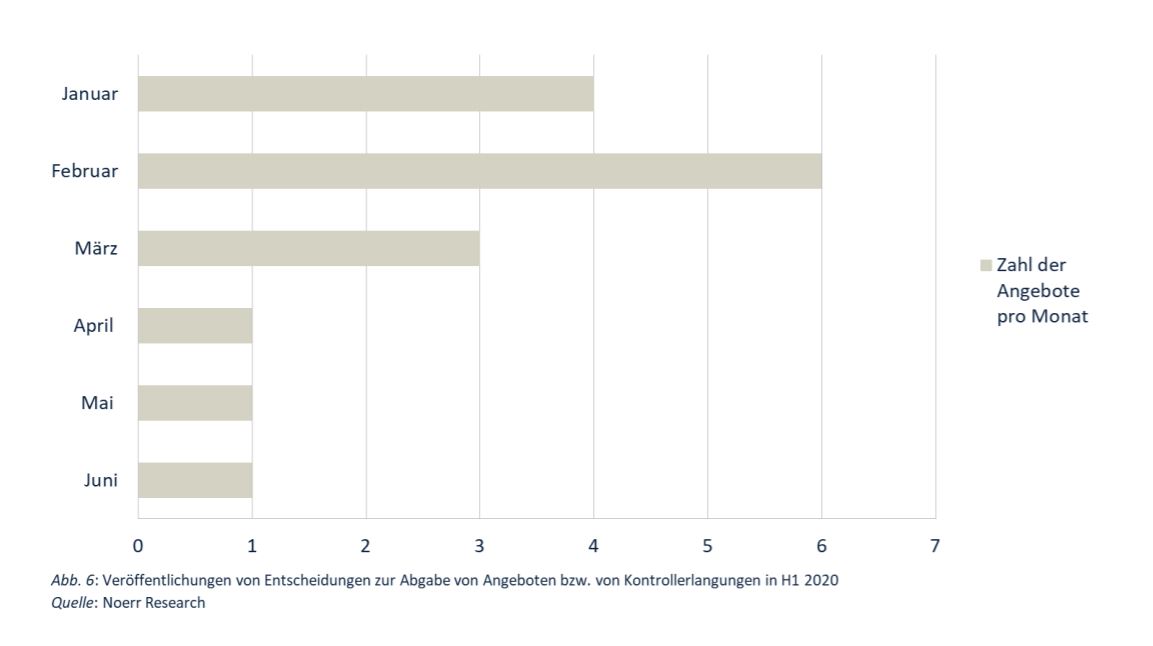 Damit lagen zwölf der 10er-Mitteilungen im Betrachtungszeitraum vor dem Tiefststand des DAX-Schlusskurses am 18. März 2020 mit 8.441,40 Punkten. In den Monaten April, Mai und Juni wurde jeweils nur eine 10er-Mitteilung veröffentlicht, was deutlich unter dem langjährigen Durchschnitt liegt, der in etwa drei 10er-Mitteilungen pro Monat beträgt (siehe hierzu eingehend Noerr Public M&A Report H1 2019). Die Covid-19-Pandemie hat also unmittelbar zu einer signifikanten Zurückhaltung bei Neutransaktionen am Markt für öffentliche Übernahmen geführt.