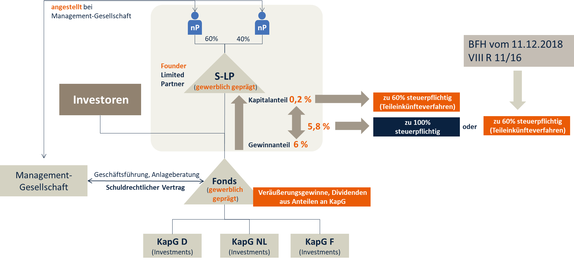 Bei Fonds, die aus deutscher steuerlicher Sicht als vermögensverwaltende Personengesellschaften ausgestaltet sind, unterliegt der Carried Interest nach der Sonderregelung des § 18 Abs. 1 Nr. 4 EStG dem Teileinkünfteverfahren, ist also nur zu 60% steuerpflichtig. Bei Steuerpflichtigen in der höchsten Tarifstufe ergibt sich so eine effektive Steuerbelastung iHv. ca. 27%.