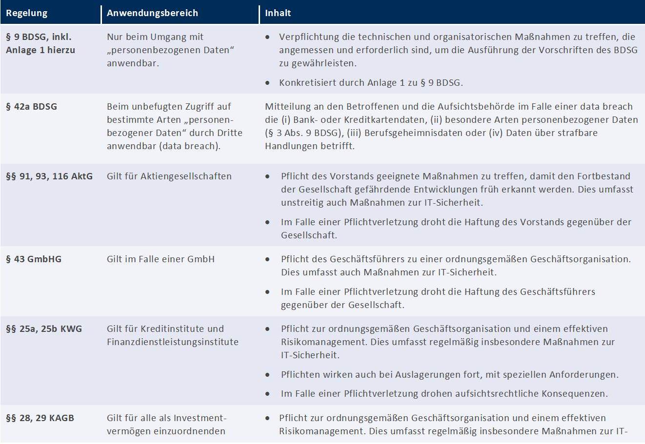 Über die tatsächlichen Gefahren hinaus lohnt auch ein Blick auf die rechtlichen Rahmenbedingungen zum Thema IT-Sicherheit. Zwar gibt es bislang nur wenig gesetzliche Regelungen zum Thema IT-Sicherheit, doch diese legen durchaus gewisse Rahmenbedingungen fest, die man kennen sollte. Überblicksartig lassen sich die wichtigsten dieser Regelungen darstellen wie folgt: