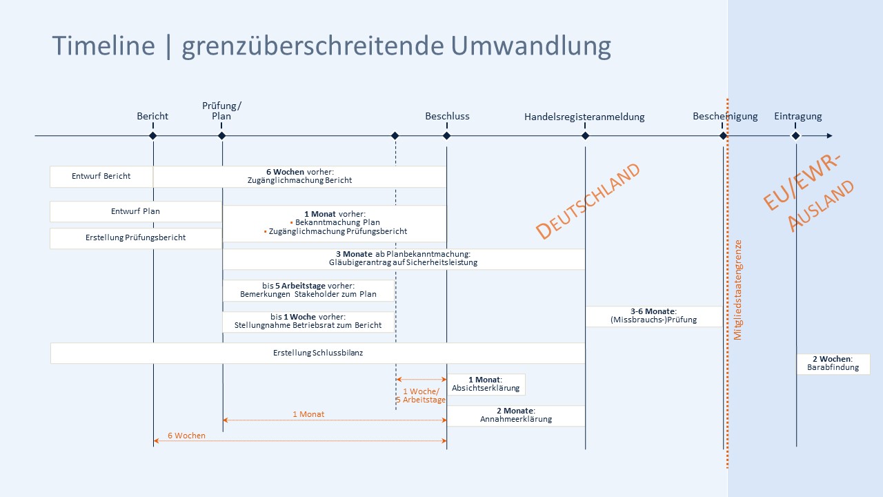 Zeitlicher Überblick einer grenzüberschreitenden Umwandlungsmaßnahme mit wesentlichen Schritten und zu beachtenden Fristen (Download als PDF beim Klick auf die Übersicht):