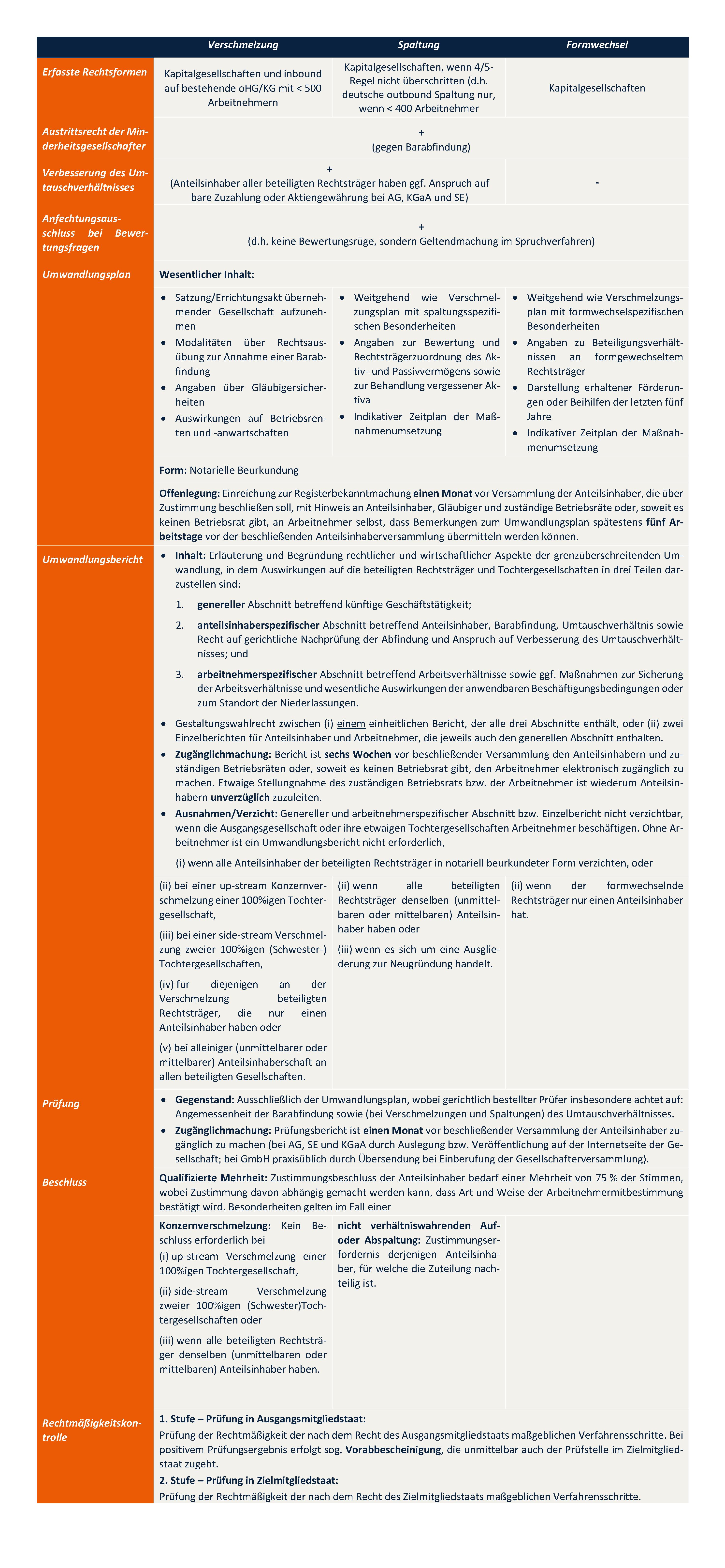 Das Gesetz zur Umsetzung der EU-Umwandlungsrichtlinie (UmRUG) (BGBl. I 2023, Nr. 51 v. 28.02.2023) ist heute in Kraft getreten, nachdem es am 20.01.2023 vom Bundestag und am 10.02.2023 vom Bundesrat verabschiedet wurde. Damit sind die Vorgaben für den Formwechsel und die Spaltung (Aufspaltung, Abspaltung und Ausgliederung) über eine oder mehrere EU/EWR-Binnengrenzen im Umwandlungsgesetz gemeinsam mit der (schon kodifizierten) grenzüberschreitenden Verschmelzung normiert. Zuvor eröffnete sich den Unternehmen in der Praxis nur der weniger rechtssichere Weg über die Grenze unter Berufung auf die Niederlassungsfreiheit (Art. 49, 54 AEUV), d.h. aber ohne Einzelregelungen, lediglich mittels entsprechender Anwendung vergleichbarer Normen. Grenzüberschreitende Spaltungen waren Unternehmen in der EU/dem EWR nach bisher überwiegender Meinung ohne zugrundeliegendes Regime in den beteiligten Mitgliedstaaten praktisch verschlossen. Der Werkzeugkasten für rechtssichere Umstrukturierungsmaßnahmen ist nun durch das UmRUG bedeutend vielfältiger geworden. Im Einzelnen bedürfen die spezifischen Verfahrensschritte einer grenzüberschreitenden Umwandlungsmaßnahme sorgfältiger und vorausschauender Planung. Auch ist zu konstatieren, dass die EU-Umwandlungsrichtline der Verfahrensbeschleunigung keine Priorität beigemessen hat – ratsam ist daher, inklusive Vorbereitungsphase wenigstens ein halbes Jahr für die gesellschaftsrechtliche Umsetzung einzuplanen (im Fall der Durchführung eines Arbeitnehmerbeteiligungsverfahrens kann das Vorhaben durchaus mehr als ein Jahr in Anspruch nehmen).