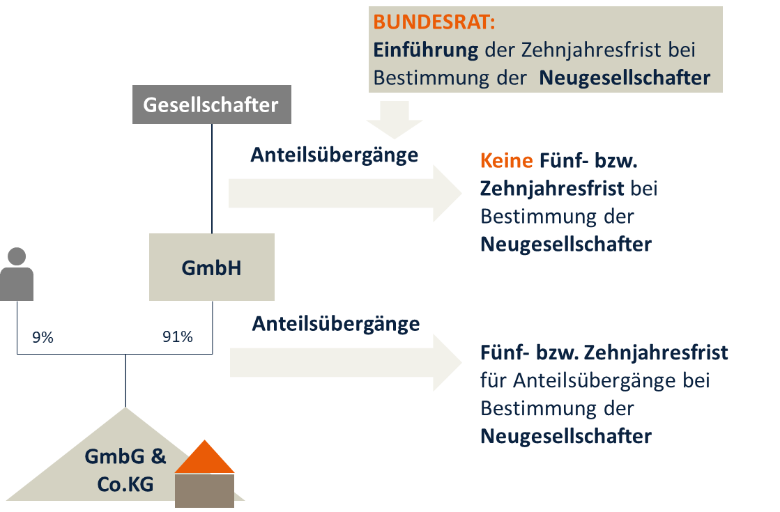 Der Bundesrat schlägt deshalb vor, auch für Zwecke der Bestimmung eines mittelbaren schädlichen Gesellschafterwechsels einen Zehnjahreszeitraum entsprechend § 1 Abs. 2a Satz 1 GrEStG einzuführen.Da auch die Bundesregierung diesem Vorschlag in ihrer Erwiderung zustimmt, ist die Umsetzung dieses Vorschlags wahrscheinlich.