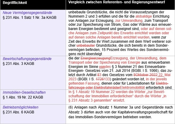 Für den Bereich der Publikums-Immobilien-Sondervermögen nach §§ 230 ff. KAGB haben sich Änderungen des Referenten- im Vergleich zum Regierungsentwurf ergeben. Diese Änderungen sind im Wortlaut in der nachfolgenden Tabelle dargestellt: