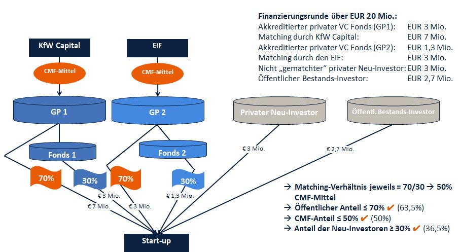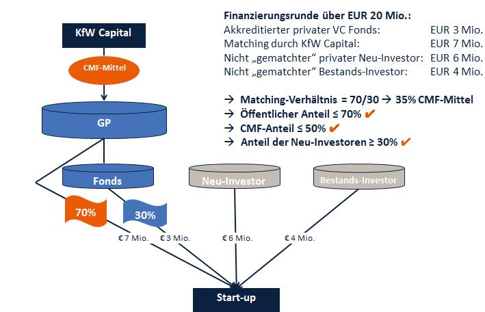 Ein Matching ist darüber hinaus nur möglich, wenn es sich um eine interne Finanzierungsrunde handelt (ausschließlich Bestands-Investoren) oder aber der Anteil der Neu-Investoren mindestens 30% beträgt. Zudem darf der Anteil der öffentlichen Mittel, zu denen neben den CMF-Mitteln auch öffentliche Mittel aus anderen Fördermaßnahmen zählen, pro Finanzierungsrunde 70% nicht übersteigen.