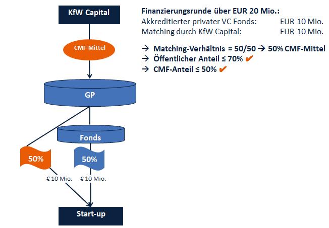Die von den betreffenden VC Fonds investierten privaten Mittel werden grundsätzlich mit 50% durch die CMF gespiegelt. Abweichend davon kann sich der betreffende GP im Hinblick auf all seine Investments auch für ein niedrigeres oder höheres Matchingverhältnis (maximal 70% öffentliche Mittel) entscheiden. Dabei ist zu beachten, dass der CMF-Anteil pro Finanzierungsrunde insgesamt 50% nicht übersteigen darf („50%-Höchstgrenze“), d.h., dass sich weitere private oder öffentliche Investoren beteiligen müssten, damit das gewünschte Matchingverhältnis von 70/30 in der jeweiligen Finanzierungsrunde zur Anwendung kommen kann und dabei dennoch nur maximal 50% aus der CMF fließen. Sollte dies nicht der Fall sein, wird das gewünschte Matchingverhältnis im Einzelfall automatisch um den Betrag reduziert, der erforderlich ist, um die 50%-Höchstgrenze zu erreichen.