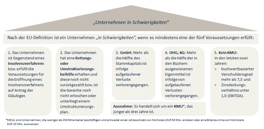 Die EU-Kommission hat am 29. Juni 2020 den zulässigen Rahmen für staatliche Beihilfen erweitert. Damit wird den Mitgliedstaaten die Möglichkeit gegeben, allen kleinen und Kleinstunternehmen, einschließlich Start-ups (d.h. Unternehmen mit weniger als 50 Beschäftigten und einem Jahresumsatz und/oder einer Jahresbilanzsumme von weniger als EUR 10 Mio.) staatliche Unterstützung auch dann zu gewähren, wenn sich diese Unternehmen am 31. Dezember 2019 bereits in finanziellen Schwierigkeiten befunden haben.