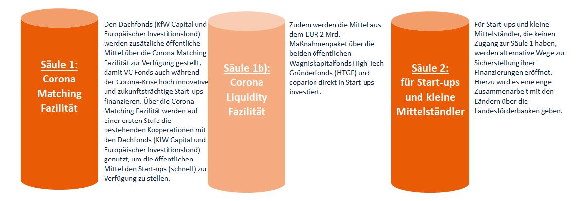 Mittel der Säule 1 sollen zudem auch direkt über die beiden öffentlichen Wagniskapitalfonds High-Tech Gründerfonds und coparion an Start-ups verteilt werden. Hierfür soll noch ein eigener Finanzierungsrahmen erarbeitet werden.