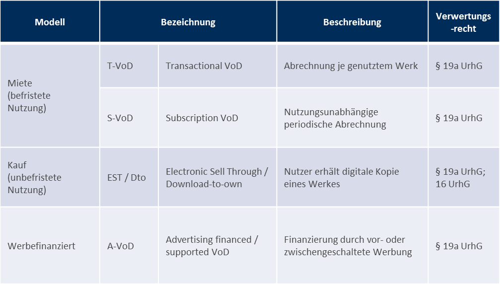 Video-on-Demand-Angebote unterscheiden sich vom klassischen Rundfunk dadurch, dass der User im Gegensatz zum linearen Fernsehen Ort und Zeit des Konsums der Inhalte frei nach seiner Wahl bestimmt. Innerhalb der VoD-Dienste ergeben sich verschiedene, nach Vertriebsart und Technik zu unterscheidende Erscheinungsformen. Wird dem User nur die Miete des Videos durch eine befristete Nutzungsmöglichkeit gestattet, unterscheidet man zwischen T-VoD (Transactional VoD), bei dem jedes genutzte Werk abgerechnet wird und S-VoD (Subscription VoD), dem eine periodische Abrechnung, z.B. durch eine monatliche Gebühr, ohne Rücksicht auf die tatsächliche Nutzung entsprechend einer Flatrate zugrunde liegt. Erhält der Kunde ein unbefristetes Nutzungsrecht, spricht man von Electronic Sell Through (EST) oder Download-to-own (DTO). Dabei erhält der Nutzer eine digitale Kopie des Werkes. Werbefinanzierte Angebote, sog. A-VoD (Advertising financed/supported VoD) zeichnen sich dadurch aus, dass während oder vor dem gewünschten Inhalt Werbung – vergleichbar mit Spotwerbung im Rundfunk – ausgestrahlt wird.