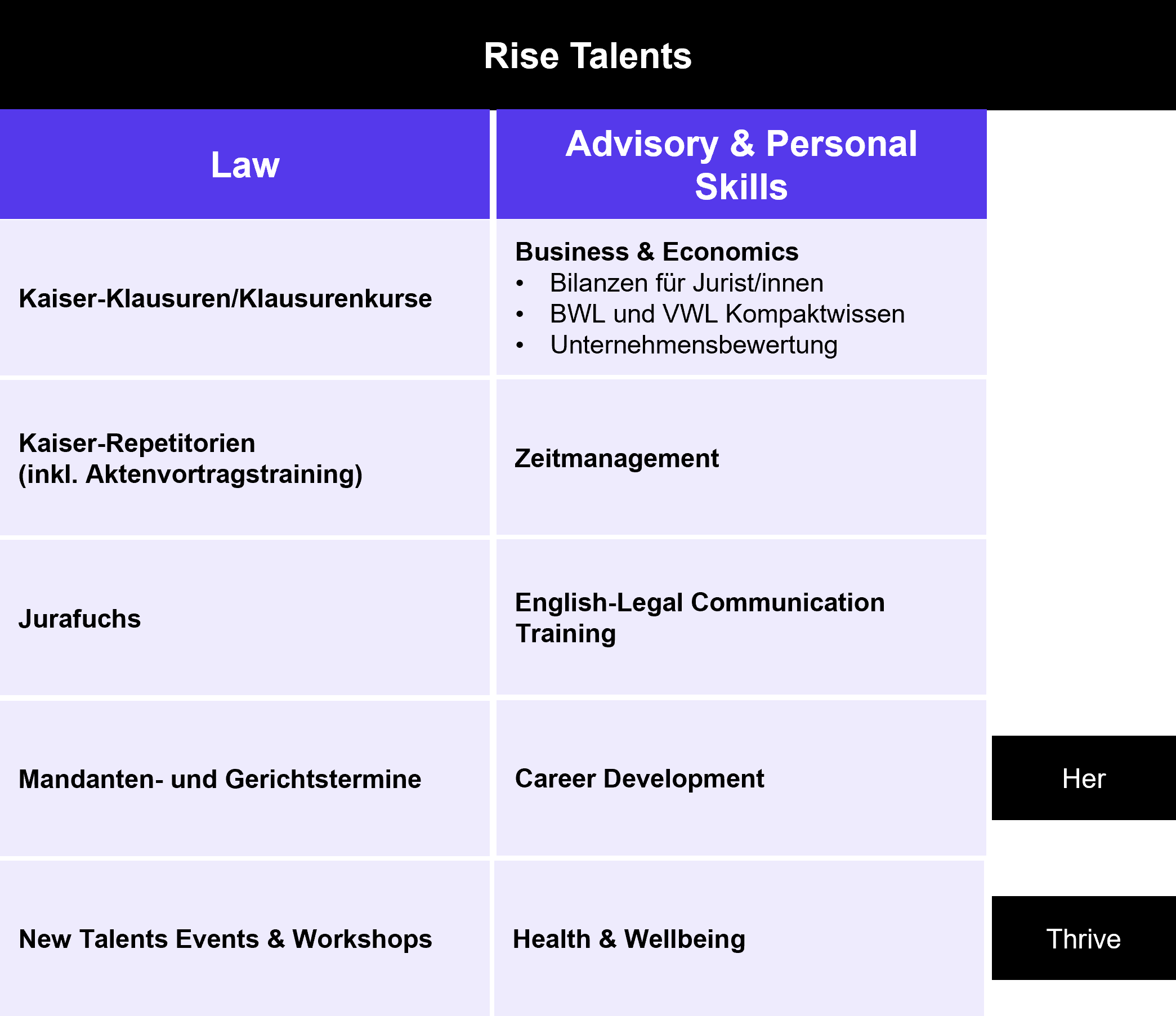 In enger Anlehnung an unser umfassendes Aus-, Fort- und Weiterbildungsprogramm Rise, bietet Rise Talents dir hilfreiche Elemente auf dem Weg zu einer gezielten fachlichen und beraterischen Qualifizierung:
