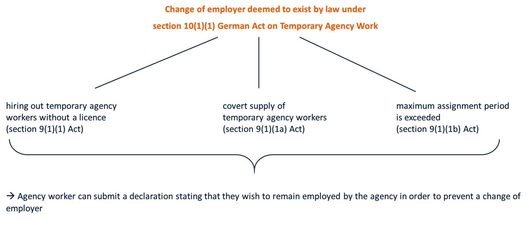 - The employment relationship with the agency only becomes ineffective after the temporary worker starts working for the user company (maximum assignment period is exceeded, licence for hiring out temporary agency workers subsequently ceases to apply or right to give instructions shifts to the party ordering the work/principal only when the contract is being implemented): the time limit begins at the time of the event that leads to the employment relationship with the agency becoming ineffective.