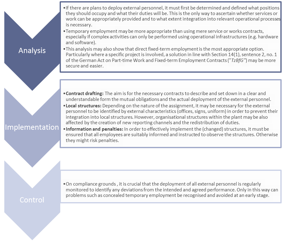 Not only as a reaction to the judgement of the LAG Baden-Württemberg but also in preparation for a planned statutory amendment, it is advisable when engaging external personnel to follow a uniform concept. Cost saving and flexibility are often the motives for concluding works contracts, service contracts or temporary employment, but operational structures must also take account of the inherent special characteristics. Only then will it be possible to minimise the risk of avoidable legal consequences with unintended costs being caused by the deployment of external personnel.