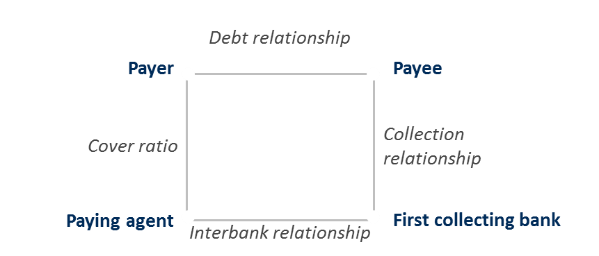 A payment by direct debit is usually based on the 4-party configuration shown. The payee specifies the amount for collection in the direct debit and submits it to his bank (the first collecting bank) which credits the amount to the payee’s account and forwards the direct debit to the payer’s bank (paying agent) which debits his account accordingly.