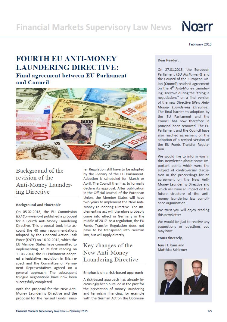 On 27.01.2015, the European Parliament (EU Parliament) and the Council of the European Union (Council) reached agreement on the 4th Anti-Money Laundering Directive during the “trilogue negotiations” on a final version of the new Directive (New Anti-Money Laundering Directive). The final barrier to adoption by the EU Parliament and the Council has now therefore in principal been removed. The EU Parliament and the Council have also reached agreement on the adoption of a revised version of the EU Funds Transfer Regulation.