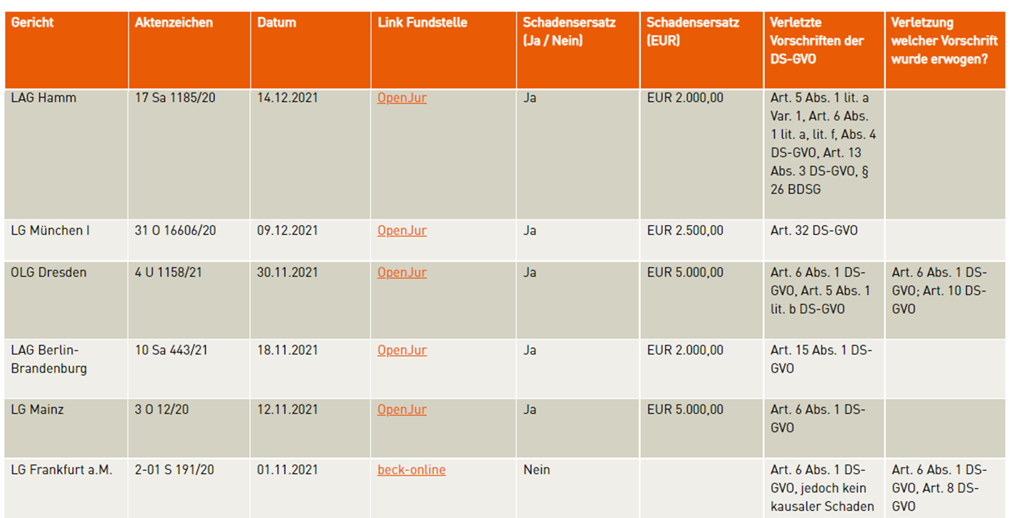 Our Noerr GDPR Damages Tracker, available at www.gdprdamages.com and www.damagestracker.com (currently in German only), shows you at a glance the case law of German courts on non-material damages under Article 82(1) GDPR.