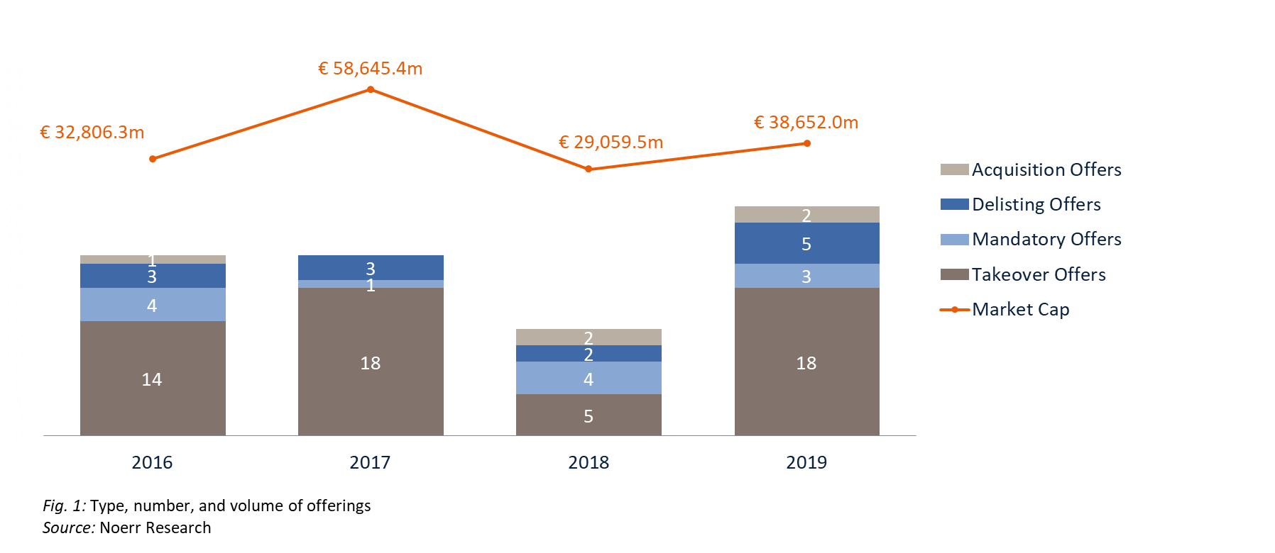 Compared to the previous year, the number of transactions in the German public takeover market grew significantly in 2019 to 28 offers that were published plus one that was prohibited by BaFin: In 2018, there were only thirteen offers (plus two that BaFin did not approve). The offer volume (as expressed by the MCO) rose from EUR 29.1 billion in 2018 to EUR 38.7 billion in 2019, representing a 32.65% increase.