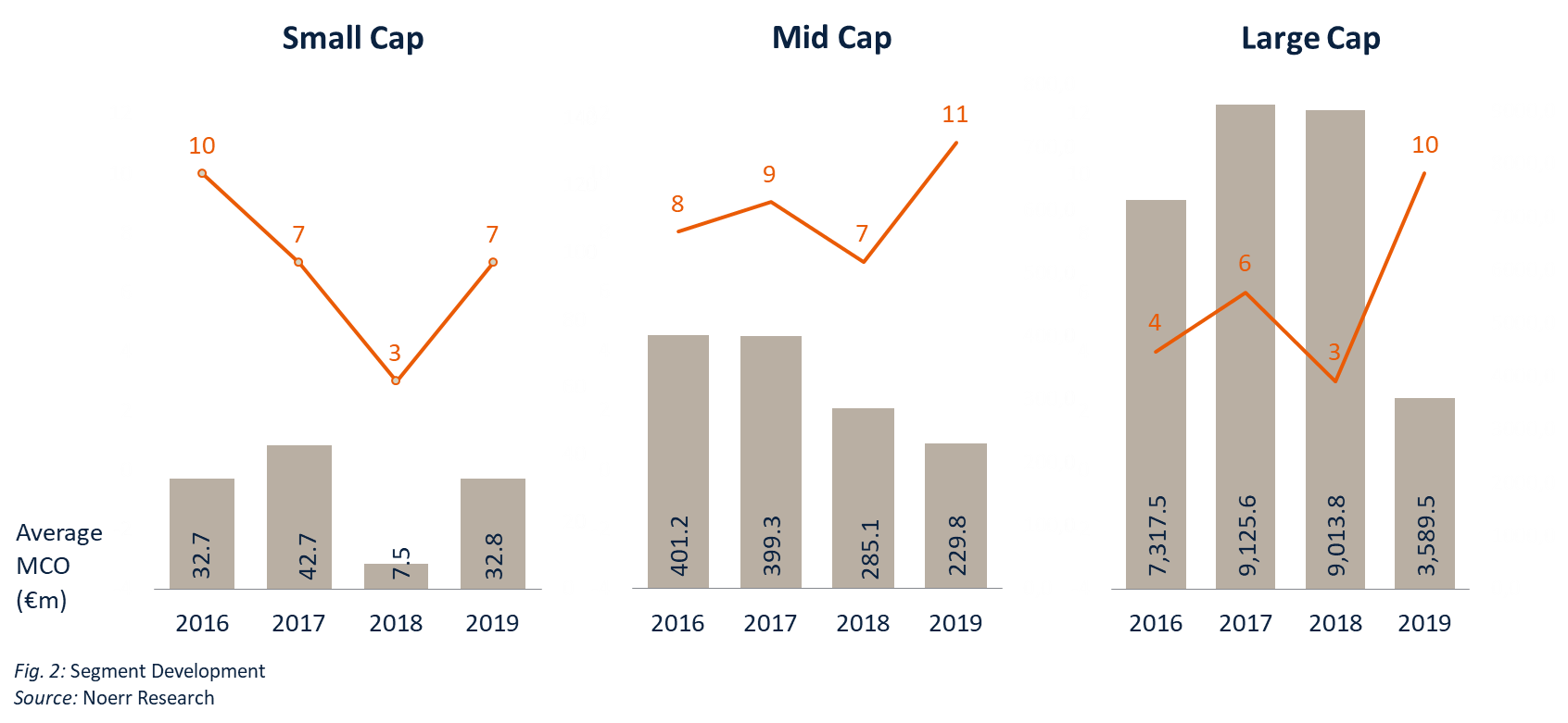 Compared to 2018, the average offer volume in the large-cap segment dropped dramatically to EUR 3,589.5 million (2018: EUR 9,013.8 million). It must be considered, though, that there was one particular offer in 2018 which comprised a volume of EUR 20 billion. No bid of this magnitude was made in 2019.