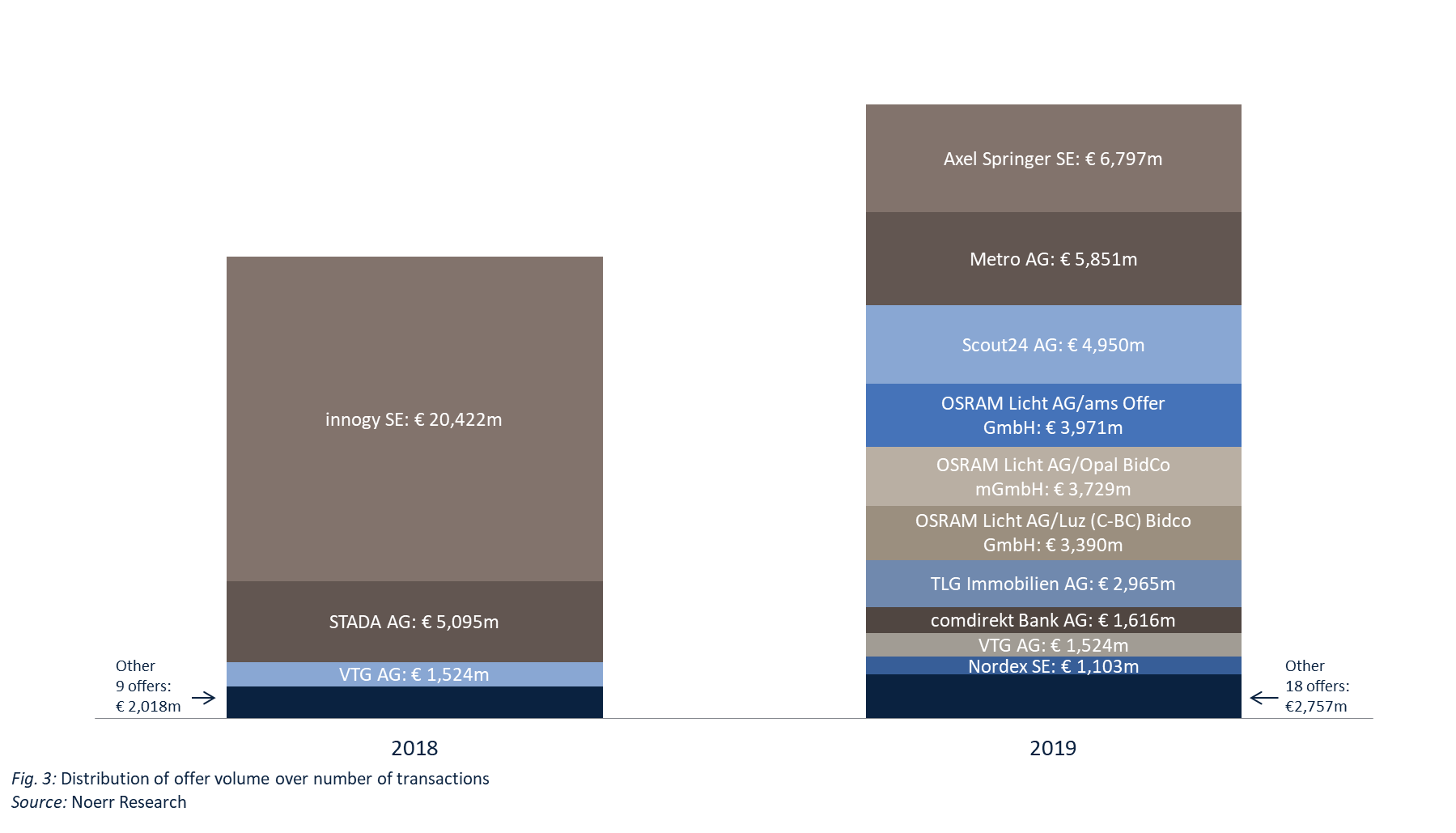 In spite of this extreme concentration in the large-cap segment – and even considering the special case of OSRAM - last year’s total offer volume was still much more evenly spread over the total number of transactions than that of the previous years. Instead of only one or two large-cap offers of extremely high volume, there was a multitude of offers with more or less similar transaction volume. Thus the long-term observation that very large individual transactions decisively influence the total market volume was not confirmed in 2019.