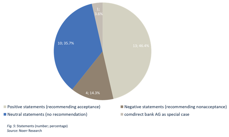The 2019 maximum of three fairness opinions ordered in connection with the preparation of one reasoned statement was reached in connection with the joint reasoned statements by the corporate bodies of METRO AG as well as Axel Springer SE, respectively. In both cases the management board of the target company ordered two fairness opinions, while the supervisory board ordered one.