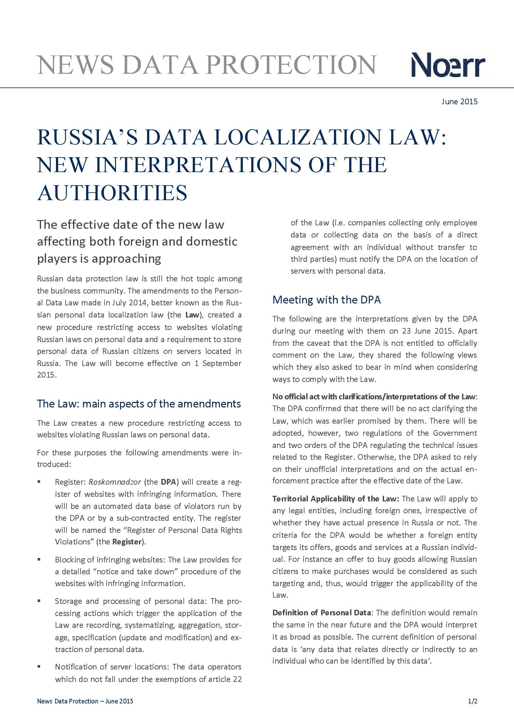 Russian data protection law is still a hot topic among the business community. The amendments to the Personal Data Law made in July 2014, better known as the Russian personal data localization law, created a new procedure restricting access to websites violating Russian laws on personal data and a requirement to store personal data of Russian citizens on servers located in Russia.The authorities promised to provide clarifications to the new law; however, following the meeting with Roskomnadzor yesterday, it appears that there will be no official clarifications and businesses need to get themselves prepared before the effective date of the Law on 1 September 2015, based on the wording of the law and the verbal comments of Roscomnadzor. Please find attached the summary of the interpretations given by the authorities during the meeting.
