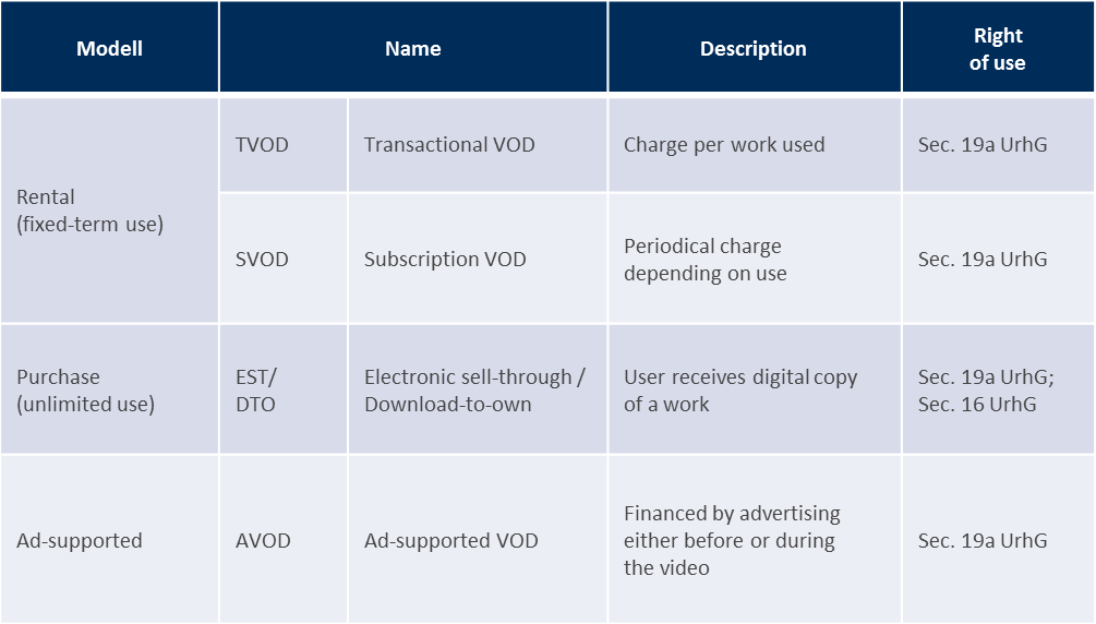 As the user has access to video content from any location and at any time he or she chooses, video on demand is not subject to broadcasting law under Section 20 of the German Copyright Act (Urhebergesetz – UrhG) but is instead covered by the law on public availability pursuant to Section 19 a UrhG under which the copyright owner can grant VOD platforms exploitation rights pursuant to Section 31 UrhG. If the business model of the VOD service enables download, this requires an additional permit for the sublicensing of the right of reproduction arising from Section 16 UrhG. An overview of this situation is presented below: